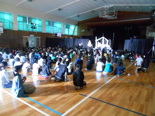 本日、人形劇団むすび座さんをお迎えして、芸術鑑賞会を行いました。演題は「オズのまほうつかい」です。