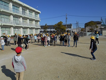 屋外では、長縄とびを行いました。晴天のもと、縄をとぶタイミングを「はい、はい」と低学年に伝える子ども達の姿が見られました。