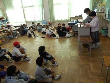 室内では、自己紹介を兼ねた私の好きな物クイズを行いました。6年生が司会となって、みんなが楽しめるように会を進行する姿が見られました。