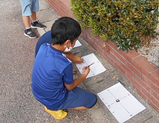 写真は、3年生「理科」で太陽の動きにかかわる観察をしている様子です。