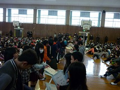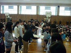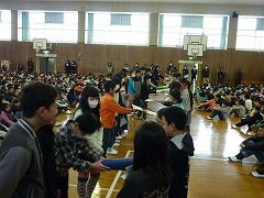 体育館中央でリーダーとサブリーダーが並び、引き継ぎです。「これを見てがんばってください!」「よろしくお願いします。」など、5年生のサブリーダーに声を掛けながら、自分たちが使ったファイルと活動をまとめた『秘伝書』を渡しました。下級生からは温かい拍手が贈られました。