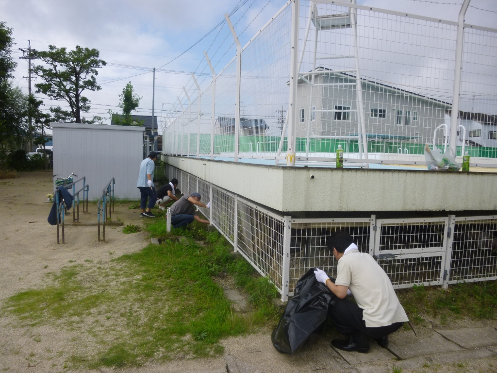 朝早くから、おやじの会とPTA役員の方々には、プールや体育館周辺の草取りをしていただきました。昨日までの雨も上がり、青空のもと、たくさんの草と戦い抜きました。そのおかげで、こんなにもきれいになりました。ありがとうございました。