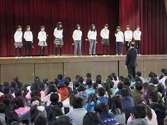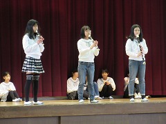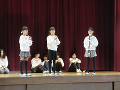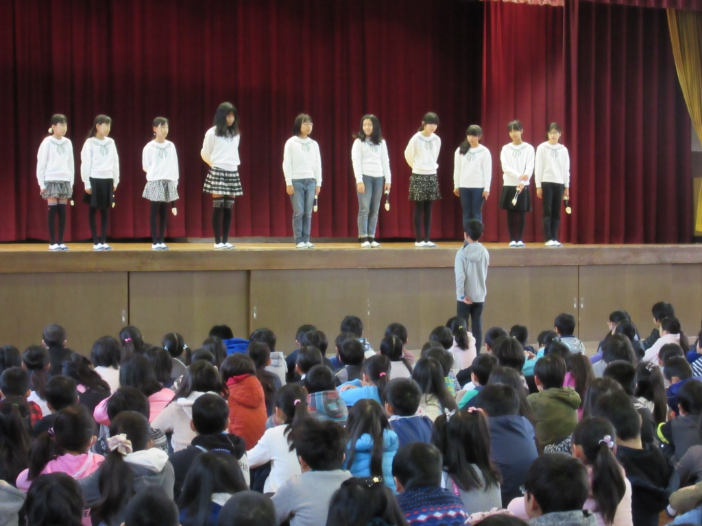 今日は、朝礼で音楽部の壮行会が行われました。28日に、音楽部がアンサンブルコンテストに参加します。その発表曲を、全校の前で披露してもらいました。3チームが参加し、曲目はそれぞれ、『ヘビーローテーション』『ふるさと』『上を向いて歩こう』です。3年生以上が習うリコーダーでの合奏ですが、音色が違う3~4種類のリコーダーで聴くと、とてもよいハーモニーになりますね。演奏後には、全校児童から大きな拍手が送られました。本番も頑張ってほしいと思います。