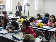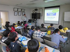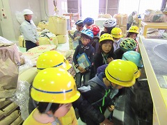 アイカ工業の作業場では、ジョリパットと呼ばれる塗料の製造工程を見せていただきました。20Lも入る缶に、どろっとした白い塗料が注ぎ込まれていきます。また、塗料と色素を混ぜるために高速回転する機械もあります。子どもたちは「すごい!」「速~い!」と大興奮でした。会社の説明では、アイカ工業の歴史や製品、工場のあるところなどを教えていただきました。初めて作った接着剤は、戦時中の「愛知無敵糊」だったそうです。それだけでも70年の歴史です。びっくりです。