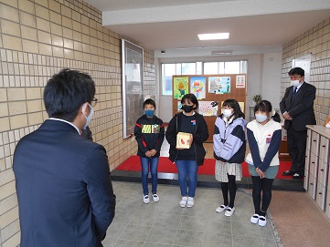 本日、児童役員の子ども達が社会福祉協議会の方に赤い羽根募金をお渡ししました。
