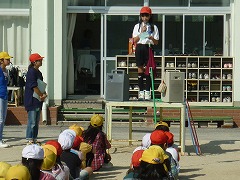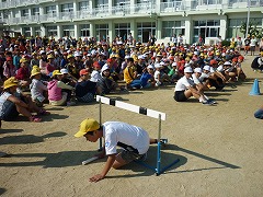 今日は、6年生の代表が種目の説明をしました。障害物リレーとバケツット(バケツにめがけてバスケのように玉入れ)です。障害物リレーは、2つのフラフープをくぐり、コーンをジグザグに走り、ハードルをくぐり(飛び越え)、バケツ、旗を回ってバトンパスします。「スローモーションでお手本を見せます。」の説明通り、6年生にはゆっくり歩いてもらい、しっかり動きを見てもらいました。やがて、6年生の闘争心に火が着き、いつの間にか全力疾走になっていました。コーンを一瞬ですり抜けたり、ハードルを軽やかに飛び越えたりと、本番そのものの動きでした。見ていた子から「やってみたい」という声が聞こえてきました。次回は、色別での練習予定ですよ。楽しみですね。