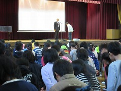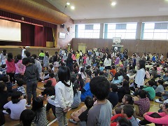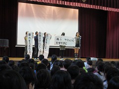 月曜日の朝礼では、校長先生から『う』つくしさについてのお話と、校長先生が見つけた校内の美しさを感じる写真の紹介がありました。最初にスライドで示されたのは、ある子の下駄箱の中の写真です。なぜこれが美しいのか分からない子が多数いる中、校長先生は言われました。「かかとがそろっていますね。」そう、靴のかかとがぴったりとそろっています。各学年で1人ずつ紹介された後、この写真を撮るために学校全体を回って、どの学年もよくそろっていることを感じられたそうです。整とんされた環境の美しさについて、改めてみんなに伝えられました。