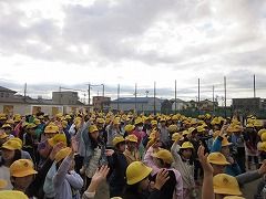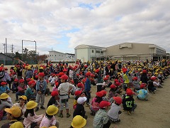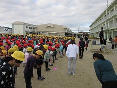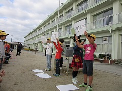 元気なあいさつで週のスタートです。 赤い羽根クイズ。①だと思う人、はーい!