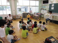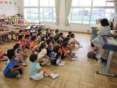 今朝は、1年生とみどり組の読み聞かせでした。雨が上がって蒸し暑くなってしまい、集中力が少々切れてしまった1年生です。姿勢が崩れるほど暑かったのでしょうか?4組では、お話が終わった後の、お母さんに向かって感想を言う時間がにぎやかでした。どうもホットケーキがとっても印象に残ったようです。
