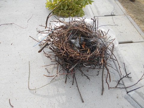 左の写真が撤去していただいた巣になります。木の枝やハンガーなどで編みこまれており、バスケットボールより一回り大きな巣でした。撤去を進めてくださった学校教育課の方々や業者の皆様に感謝です。