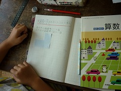 授業内容は『面積』です。L字型の図形の面積を工夫して求めるのです。まずは1人ずつ考え、次に意見を伝え合うために席を移動して多くの子と意見交換をしました。『左右2つに分ける』『3つの部分に分けて足す』『大きな長方形から取り除いた残り』『切って横につなげて細長い長方形にする』という4つの考え方が出ました。黒板に書かれた意見を先生がまとめ、分けたり継ぎ足したりすると、長方形や正方形の公式を使って求められるとまとめました。子どもたちが、先生に協力して一生懸命だったのが印象的でした。