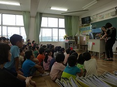3、4組はプールの後でしたが、てきぱき着替えて素早く読み聞かせの準備ができました。どちらの教室も、拍手でお母さん方への感謝を表すことができました。いつもの読み聞かせとは違った大型絵本を前に、子どもたちの関心は高まります。中には指を指してお話に食いつく子も出るほどでした。