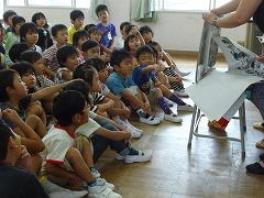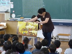 PTA図書委員会のお母さんたちによる大型絵本での読み聞かせがありました。1年生が、2つの部屋に分かれてお話を聞きます。