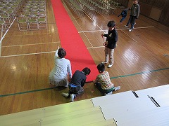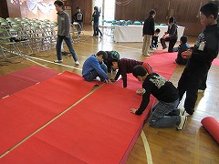 明日は卒業式です。5年生は在校生代表として式に出席します。他の学年が帰ったあと、5年生は卒業式の会場作りを行いました。