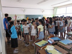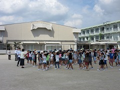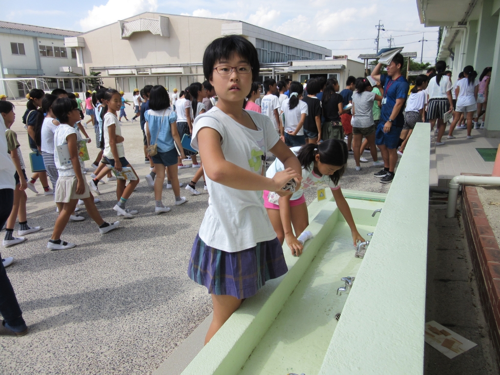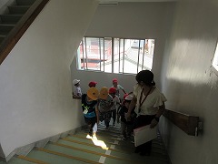 9時50分に地震の効果音とともに緊急放送が入ります。「机の下に潜りなさい。」「運動場に避難しなさい。」放送後、担任の先生の指示を受け、子どもたちはてきぱきと整列・避難しました。もちろん、頭を本などで守りながらです。全校児童が校舎外に出るまで約4分。点呼完了までは約5分と、たいへん素早い避難でした。その後、液状化や堤防決壊による洪水を想定し、3階に避難しました。これは約10分でした。この避難でも、全校児童が一斉に動いているにも関わらず、校舎内はとても静かでした。昨日に引き続き、とても意識の高い訓練になりました。
