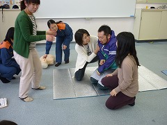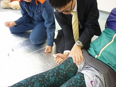 教室でアナフィラキシーショックのような症状が出た時を想定し、クラスの子に頼んで職員室へ先生を呼びに行かせたり、保健の先生を呼んできてもらったりするという想定で対応を考えました。また、万が一のエピペンは、太ももに押し当てて5秒待つなど、使い方についても学びました。救急救命法では、心肺蘇生法やAEDの使い方について練習しました。対応の方法はしっかりと知っていなければいけませんが、使わなくていいような指導や生活をしていかなければいけないと感じました。