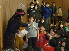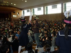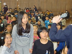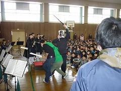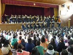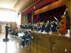 はじめに、イントロクイズをやっていただきました。どこかで聞いたことのあるメロディーがクイズになり、低学年は大興奮!あまりの興奮に答えを「え~っと・・・忘れました!」と言ってしまうほどでした。また、クイズの不正解者には厳しい『おしおき』がありました♪その後、スターウォーズのテーマなどの演奏を聴きました。大人数で奏でる合奏曲は、小学生にとってとても衝撃的で、教室でも「すごかったね!」と口々に漏らしていました。中学生のお兄さん、お姉さんにあこがれた子もたくさんいることでしょうね。