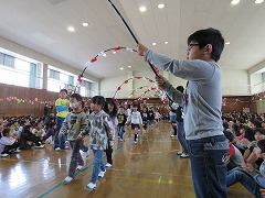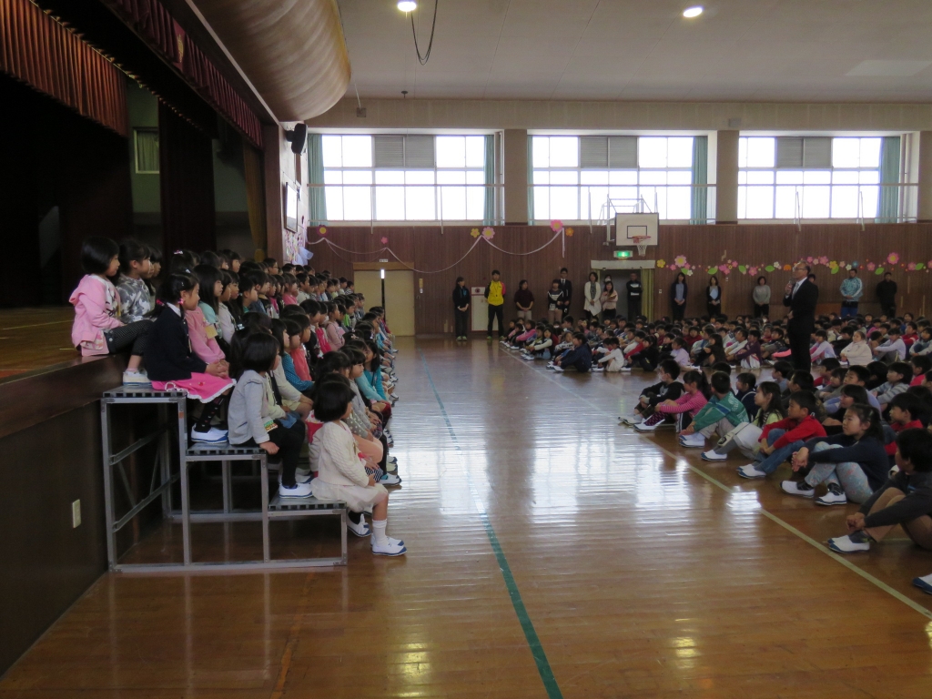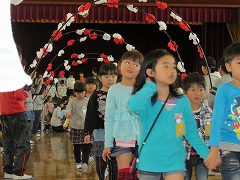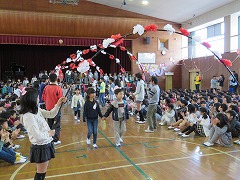 今日は対面式です。新1年生と在校生の顔合わせの会です。2~6年生が体育館で待機する中、アーチをくぐって1年生が入場しました。