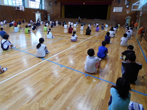 本日、体育館に6年生児童が集まり日帰り修学旅行について説明が行われました。