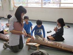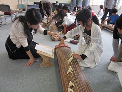 特別棟の廊下には、雅?な音色が聞こえていました。多目的室で爪を付けた5年生が、『さくら』を琴で演奏していたのです。音階に合った絃(弦)を順に『七(本目)』『七』『八』と弾けば、「さ~く~ら~♪」と気持ちよく音が出ます。初体験の琴に、子どもたちは「難しいな、これ・・・。」「あー、こうやるのか!」とつぶやきながら、一生懸命に絃を弾いていました。やがて、徐々になめらかな『さくら』の演奏になっていきました。普段は体験することがほとんどない、貴重な体験ができました。