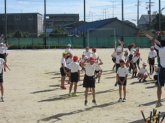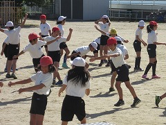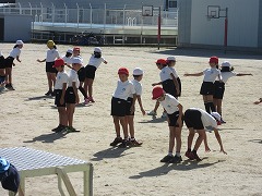 1つ目は手押し相撲でした。一押しで勝負を決める子がいるかと思えば、互いに牽制し合って勝負がつかない子もいました。負けたらスクワットをすることになるので必死です。2つ目は、片足立ちでの手押し相撲でした。準備の段階ですでにふらつく子が多数です。相手を押さなくても、待っていれば勝てるのでは?と思える様子でした。案の定、相手を押すよりも、自分のバランスを保つので精一杯な勝負も見られました。3つ目は尻相撲でした。これは一瞬で勝負がつきます。おしりをぶつけ合い、いかに足を動かさないよう踏ん張るかのがまん比べです。職員室にいた先生たちは、「昔はこういう遊びをよくしたけど、最近はあまり見ないね。」と、懐かしそうに運動場を眺めていました。
