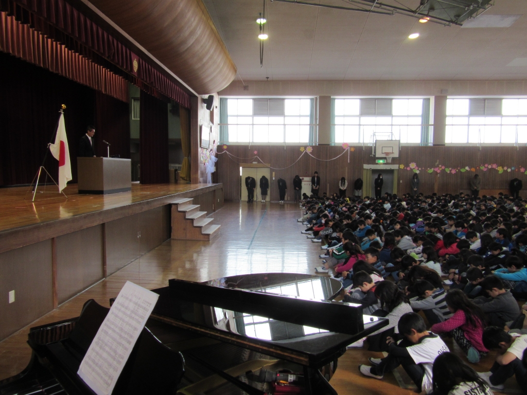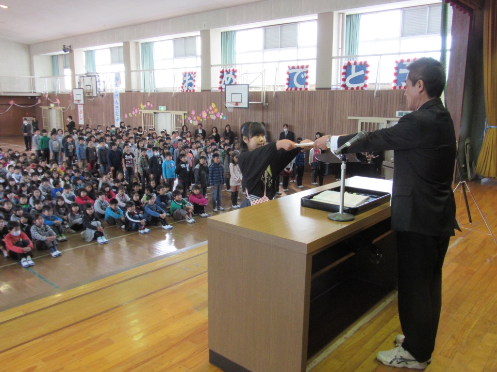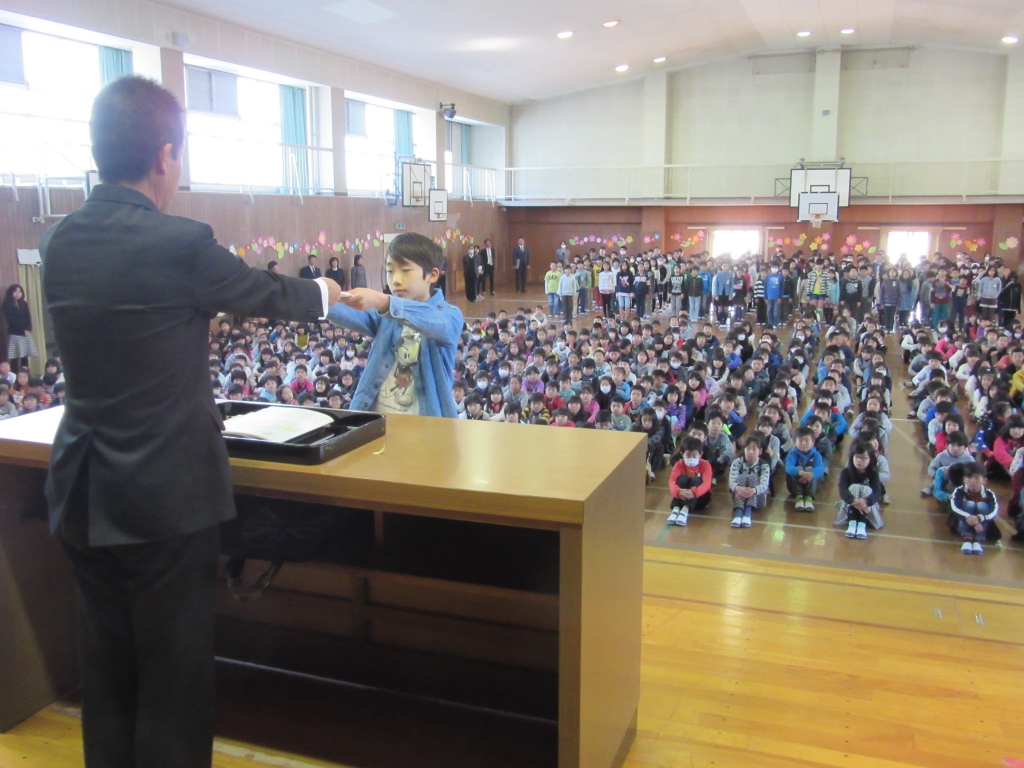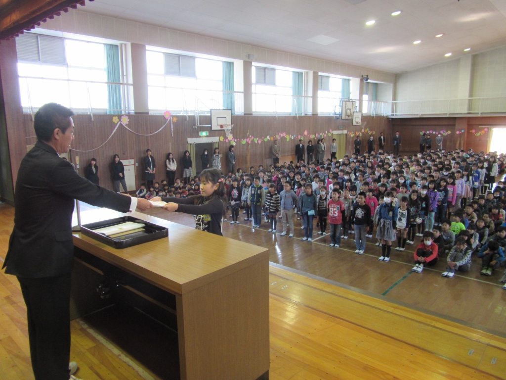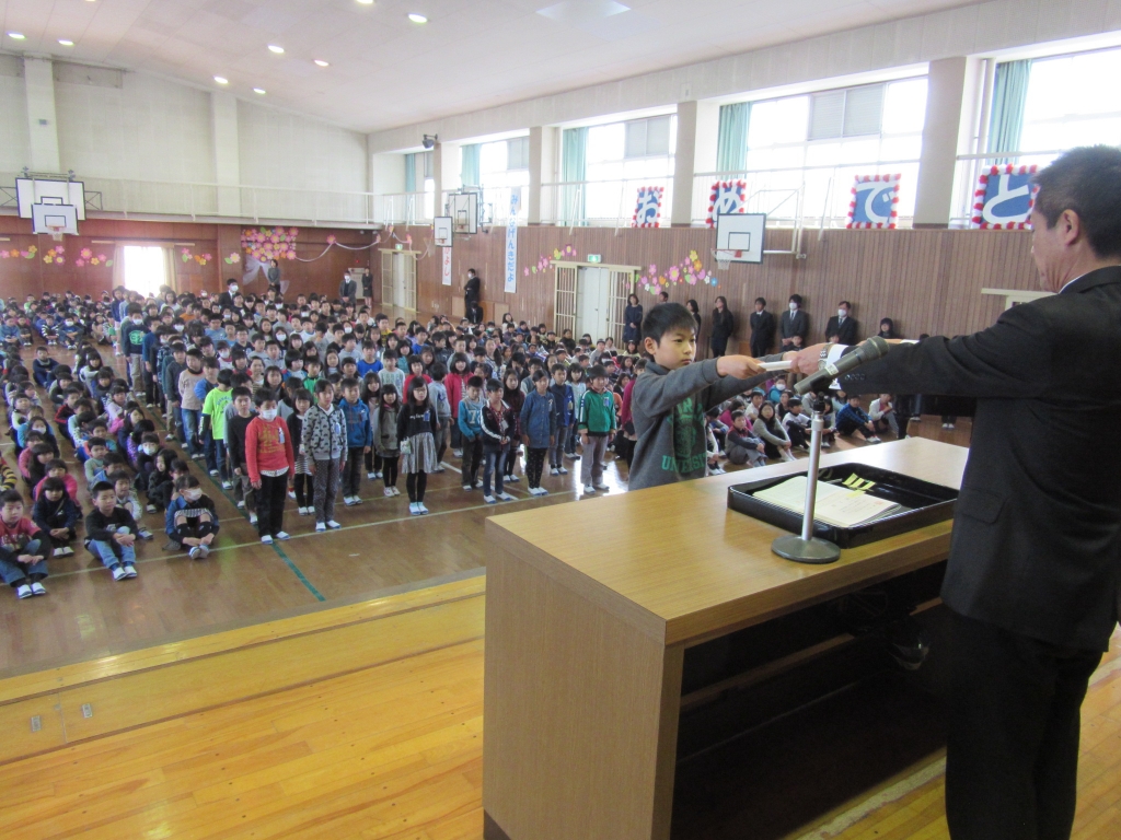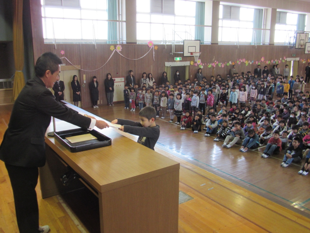 平成27年度最後の日です。1時間目は修了式です。校長先生から、この学年の学習を終えましたという修了証(通知表の裏です)をいただきました。今の学年から全員進級し、4月からは学年が一つずつ上がります。