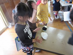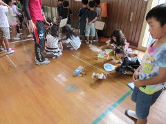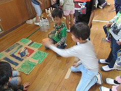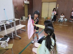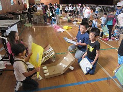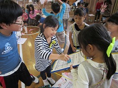 「〇〇、どうですか~!」「◇◇、楽しいよ~!」という呼び込みの声、「△秒間で☆☆を叩きます。優しく叩いてください。」などの説明、「やったー!」「よし!」という1年生の歓声で、体育館は大にぎわいでした。1年生たちは、お店をたくさんめぐり、スタンプをいっぱいもらっていました。印象に残ったのは、1年生と2年生が一緒に合奏を楽しむお店です。2年生が箱を太鼓代わりに叩き、お客の1年生がペットボトルのギザギザを割り箸でこすって音を出して、一緒に『かえるのうた』を歌います。歌い終わった後にゲームで遊んでもらうのです。ゲームを楽しんでもらうだけでなく、一緒に合唱・合奏するというアイデアがすばらしいと思いました。