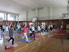 「腕立て伏せの姿勢から、右足を手の間に入れて・・・。」というように、講師の先生から、なかなか厳しいポーズの指示が出ます。参加された皆さんは、少しずつ足を動かし(いたたた・・・)先生と同じポーズを取ります。その体勢を保持したまま十数秒。このように、普段は使わない筋肉を駆使したヨガをおよそ1時間半続けました。後半には、皆さんの額や服に汗がにじんでいました。苦しいポーズが多くても、皆さん笑顔でヨガを行っていたのが印象的でした。