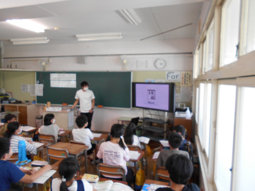 写真は6年生の英語学習の授業の様子です。大型テレビにコンピュータやiPadをつなぎ、デジタル教科書で映像や音声を示しながら学習を進めています。