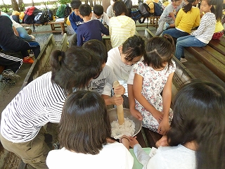杵と臼でもちつき体験をしました。できたてのおもちをいただきました。