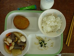 10日の給食は、ご飯、牛乳、関東煮、コロッケ、ほうれん草ともやしの和え物、菜めしふりかけでした。