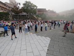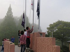すぐ横を雲が流れる中、ラジオ体操をしました。