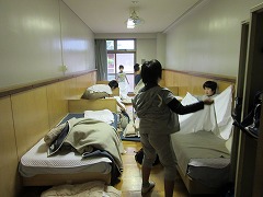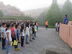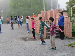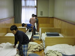 6時半の起床で始まる2日目は、7時の朝の集いが最初のイベントです。起床後の30分は、洗面、身支度、シーツたたみと、やることはいっぱいでしたが、子どもたちは頑張って時間に間に合わせました。