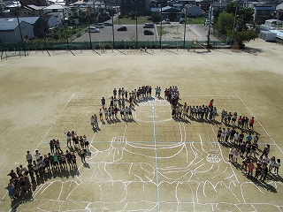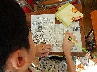 算数の拡大と縮小の学習を生かして、奈良の大仏を運動場に描いてみました。まずはじめに、各クラスで奈良の大仏の1/100縮図を基に、実際の大きさを計算しました。そのあと、運動場に実物大の奈良の大仏を6年生のみんなで描きました。