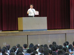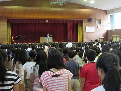 70日間の1学期も終業式を迎えました。校長先生からは、様々な出会いのこと、学年に応じた成長をみなさんから感じたと話されました。また、校長先生は何のために学校に来るのかを質問されました。みなさんはどう考えるでしょうか?校長先生は、大人になるために、幸せになるために学校に来るのだと考えているそうです。しかし、時にはつらく悲しいこともあったでしょう。しかし、学校に休まずに来ることを考えれば、体育館にいる子は全員『◎』です、と言われ、校長先生からの通知表?として、『◎』と『100点』を見せていただきました。2学期も、『◎』と『100点』を目指して頑張ってくださいと激励されました。