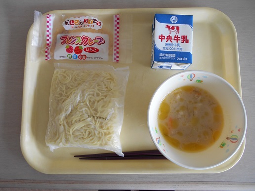 本日の給食は、バイタンラーメン、クレープ、牛乳です。普段の給食に近いメニューでした。感謝していただきます。