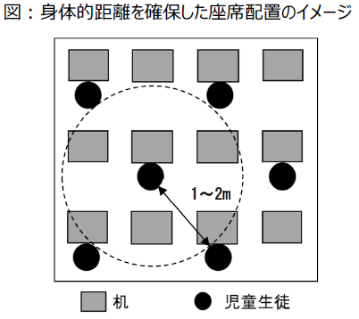 上の図は学校再開に向けて、身体的距離の確保した座席配置となります。5月28日~6月12日、全校を2つのグループに分けて学校が再開さるため、各学級20名程度の登校になります。