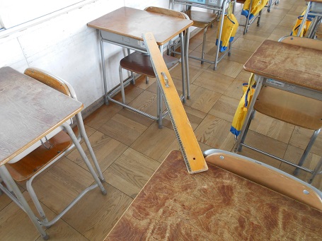 写真は実際の座席配置です。1m定規からもわかるように、1m以上の間隔を確保して教室に座席を配置しました。