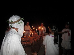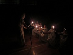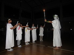 体育館の電気が消え、火の神が厳かに入場します。「儀式の火」の始まりです。続いて、5人の火の精も入場します。次に、火の神からキャンドルの炎をいただき、中央のトーチに点火をします。全員が中央の火に心を集めた、静かで雰囲気のある儀式の火となりました。
