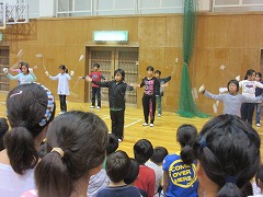儀式の火の後は、楽しい親睦の時間です。ゲームやダンスで、子どもたちの笑い声が体育館いっぱいに響きます。「ソーラン!ソーラン!はい!!はい!!」「アブラハムに~は7人の子!」「5-1、5-1ネット!」「猛獣狩りに行こうよ!」など、学年全体のダンスや各クラスのスタンツのかけ声もよく聞こえます。楽しい時間はあっという間に過ぎてしまいました。