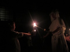 楽しい時間は過ぎ、いよいよ最後のセレモニー「送別の火」となりました。中央のトーチのろうそくはとても短くなっています。再び体育館の電気が消え、みんなを見守っていた火の神が再登場。代表の子が「元気の火」「責任の火」「友情の火」「希望の火」「夢の火」の5つをいただき、同時に誓いの言葉を述べました。この野外活動で得た友情を、これからも大切にしてくださいね。