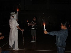 天気の回復をみんなが願っていましたが、夜の天気も雨。体育館でのキャンドルファイヤーになりました。外でできなくてもがっかりしません。なぜなら、体育館では、スタンツの様子がはっきりと見えるのですから。