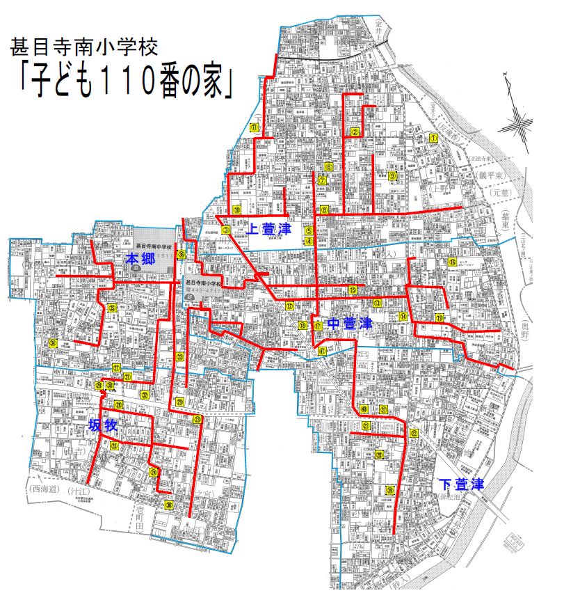 7月20日(月)の一斉下校時に「子ども110番の家」連絡訓練を行います。(地図の黄色い場所が「子ども110番の家」です)