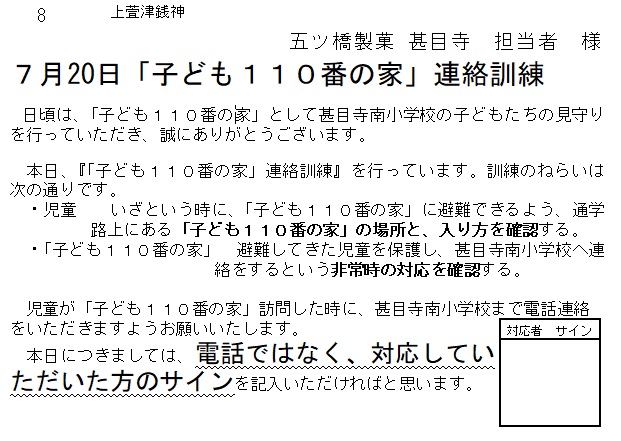 この訓練にかかわり、下校時に「子ども110番の家」を確認する通学団がいくつかあります。その団については通常の下校に比べ15分ほど帰宅時刻が遅くなることが予想されますのでご承知おきください。