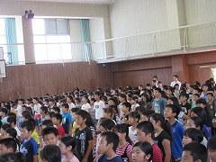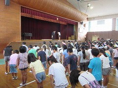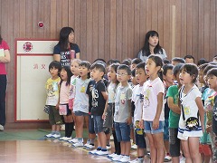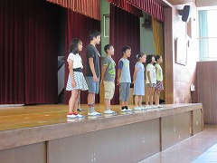 朝礼の前に、集会委員のリードで「レッツゴー!あしたへ」を歌いました。