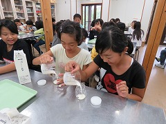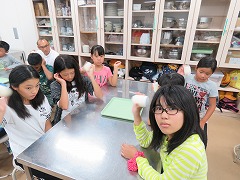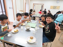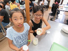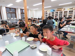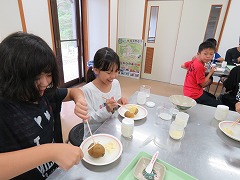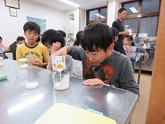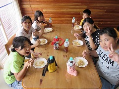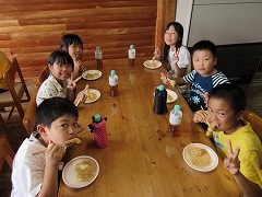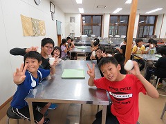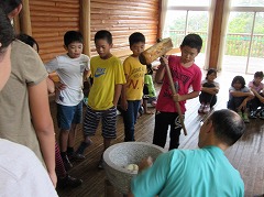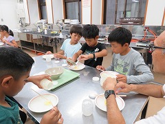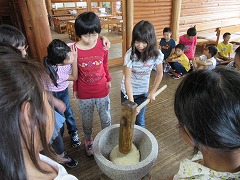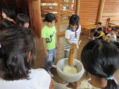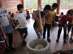 野外活動の最後のイベントは体験教室です。もちつき、五平餅づくり、バターづくり、自然薯すりの4つに分かれて体験学習を行いました。さらに、この体験の成果がそのまま昼食になります。子どもたちは、楽しみながらも真剣に活動しました。