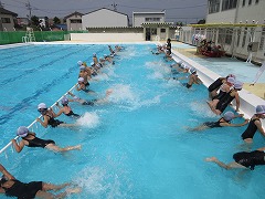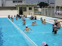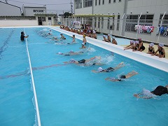 昨日の雨があがり、1時間目から水泳ができる日になりました。2時間目の2年3、4組では、水中ダッシュなどの水慣れ、水遊びだけでなく、少しずつ水泳に近づけていくために練習をしました。今日は、バタ足と蹴伸びの練習をしました。