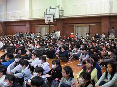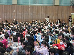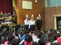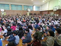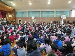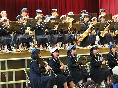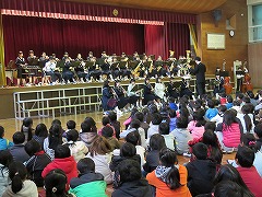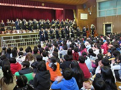 5時間目に、甚目寺南中学校の吹奏楽部の皆さんに演奏会を行っていただきました。1曲目は行進曲。リズムがとりやすく、低学年を中心に体を揺らして演奏を楽しんでいました。また、指揮者のまねをして手を振る子もいました。2曲目は国民的猫型ロボットのテーマ曲です。吹奏楽部の皆さんは、イメージカラー(青、白、赤)のベレー帽をかぶり、雰囲気作り。演奏が始まると、子どもたちはいっそうリズムに乗り、歌詞を口ずさむ姿が見られました。最後は映画『君の名は。』のメドレーです。手拍子やウェーブで、全校児童が合奏に参加しました。