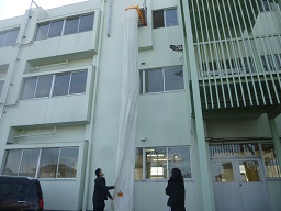 消防署職員の方に避難訓練を実際にみてもらい、火災時では煙がもっとも危険なので