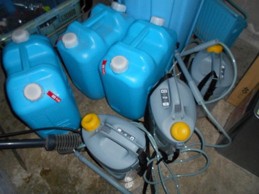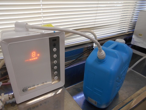 左の写真は、甚目寺保健センターで次亜塩素酸水をポリタンクに入れている様子です。